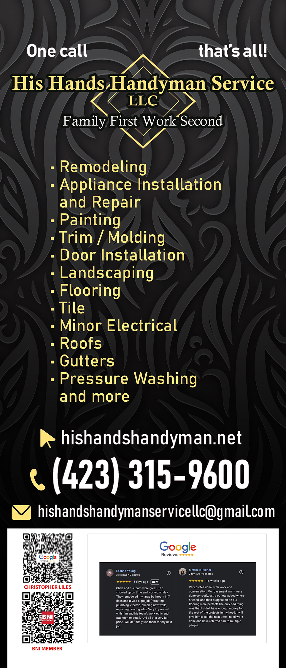 We are your one-stop shop for all home improvement needs in Chattanooga, TN. Our team of skilled professionals is dedicated to providing high-quality handyman services that exceed your expectations every time. Our services are designed to enhance the beauty, functionality, and value of your home while also ensuring your complete satisfaction. At His Hands Handyman Service, we specialize in various services, including home remodeling, appliance repair, roofing, painting, plumbing, electrical, and gutter services. Our team has the latest tools and equipment and years of experience providing superior handyman services. Whether you're planning a major home renovation project or need minor repairs, we're here to help. Our home remodeling services can transform your living space into a beautiful, comfortable, and functional area where you can relax and entertain guests. We offer roofing services to keep your home safe and protected from the elements while enhancing its curb appeal. Our painting services are perfect for giving your home a new look and feel.